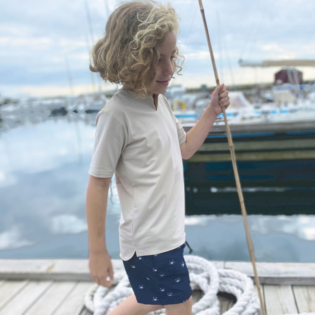 Petit Crabe Hugo UV solbluse med korte ærmer, kina krave og anker applikation på ryggen.